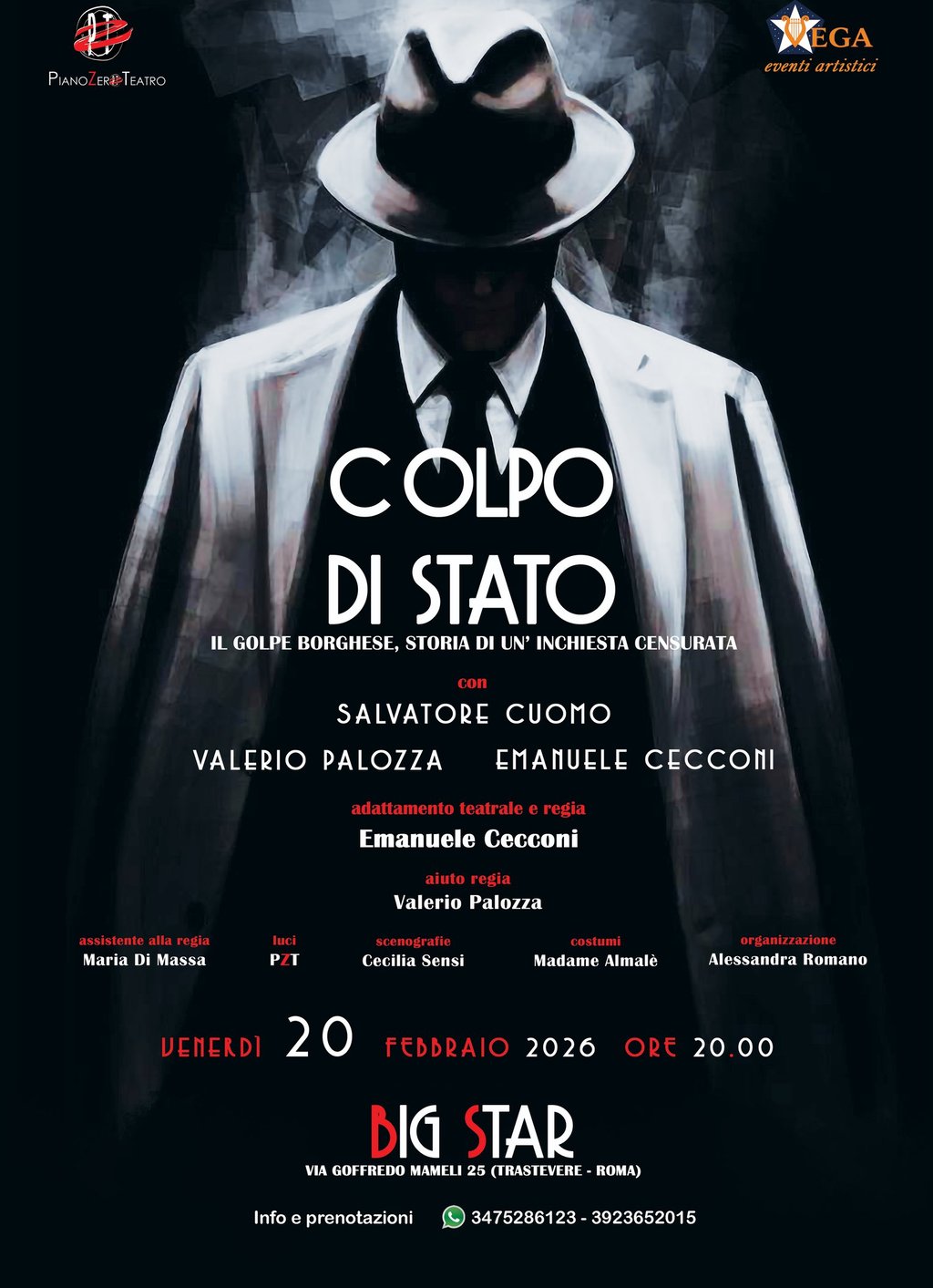 Con "Colpo di Stato" Piano Zero Teatro e Vega Eventi Artistici portano in scena un teatro d’inchiesta che si beve d’un fiato: fatti reali italiani, documenti, contraddizioni, ombre e domande scomode. Non una conferenza. Non una lezione. Uno spettacolo. Si inizia il 20 febbraio a Roma col "Golpe Borghese"