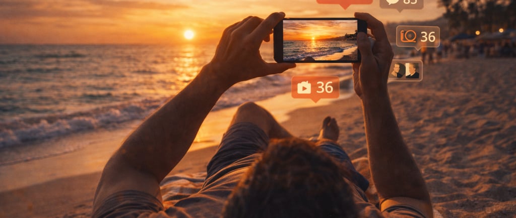 Un uomo disteso su una spiaggia, con il telefono sollevato sopra la testa, scatta la foto del tramonto. Non per sé. Per dimostrarsi - agli altri e a se stesso - che stava vivendo un momento. È l'istantanea perfetta di un'epoca che ha trasformato il riposo in rendiconto.