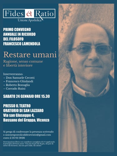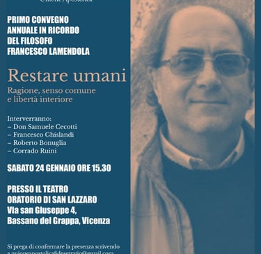 È anche con questo spirito che, sabato 24 gennaio 2026, si terrà a Bassano del Grappa (VI) il primo convegno annuale in ricordo del prof. Francesco Lamendola, organizzato dall’Unione Apostolica Fides et Ratio, presso il Teatro Oratorio di San Lazzaro, con inizio alle ore 15.30. Il titolo, “Restare umani: ragione, senso comune e libertà interiore”, riprende esplicitamente i nuclei più densi delle Carte di Venezia e intende rilanciarne la domanda fondamentale: come si difende l’umano quando la pressione del conformismo, dell’emergenza permanente e della narrazione totalizzante tende a erodere le facoltà interiori? Interverranno don Samuele Cecotti, Francesco Ghislandi, Roberto Bonuglia e Corrado Ruini, con contributi registrati di altri intellettuali. Per partecipare basta scrivere a unioneapostolicafidesetratio@gmail.com e indicare il numero delle persone che saranno presenti.
